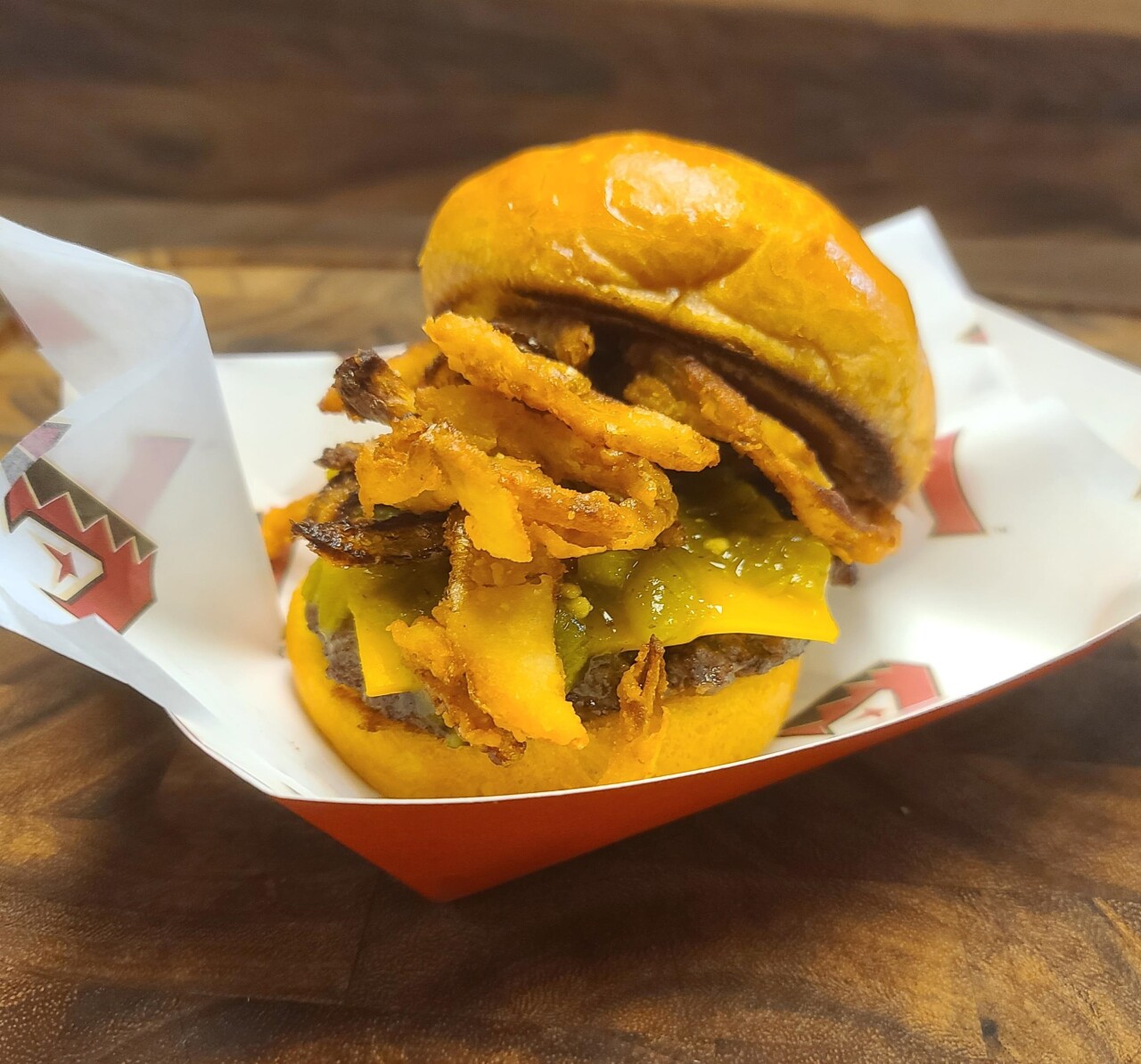 Si te gusta el whisky y la carne, acércate a Burger Burger y prueba Hamburguesa de whisky Hatch Valley Construido con amor triturado y sobre, queso cheddar añejo, salsa de whisky BBQ, 505 chiles verdes asados a la llama y pajitas de cebolla crujientes en un panecillo de papa.