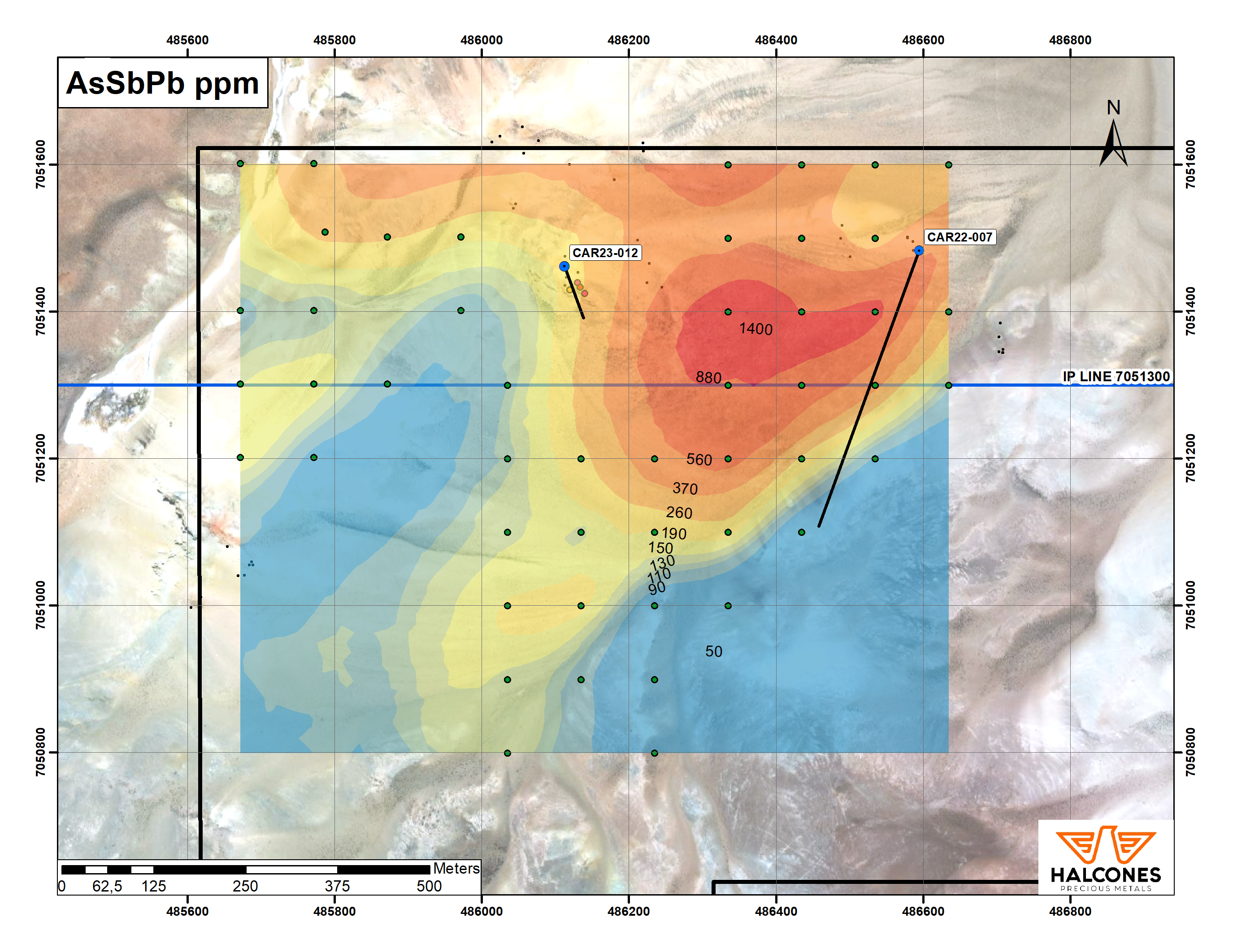 La compañía tiene la intención de centrarse inicialmente en el objetivo noroeste en la próxima campaña antes de pasar al objetivo central. Se identificaron elementos importantes en el suelo cercano al tajo CAR23-012 con niveles elevados de antimonio y arsénico. Las concentraciones elevadas del elemento pionero coinciden con un aumento reciente en la resistencia expansiva en el mismo sitio. Un programa de muestreo de sedimentos coloidales y una mayor cobertura de IP, junto con excelentes resultados de perforación inicial, han mejorado la orientación para el próximo programa de perforación.