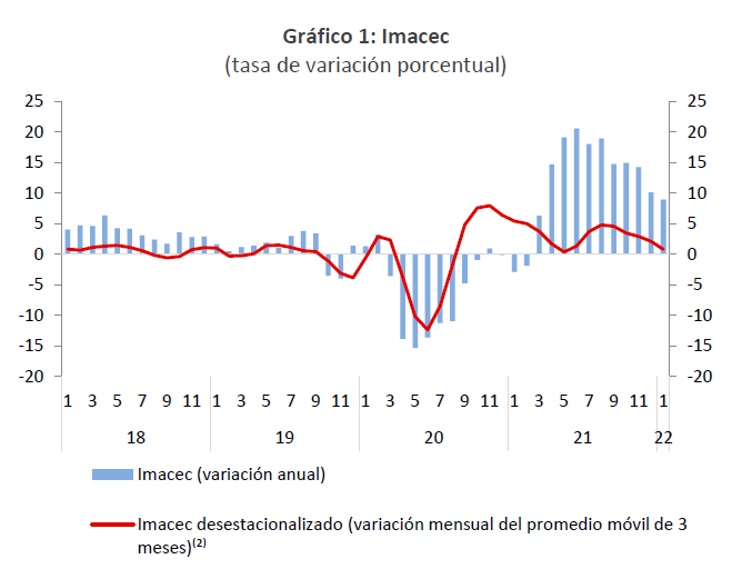 Según información preliminar, en enero pasado el índice Imacec aumentó un 9,0% respecto al mismo mes del año anterior (Gráfico 1). La serie desestacionalizada cayó un 1,0% respecto del mes anterior y aumentó un 7,5% en los últimos doce meses. Enero de 2022 llegó con un día hábil adicional al de enero de 2021.