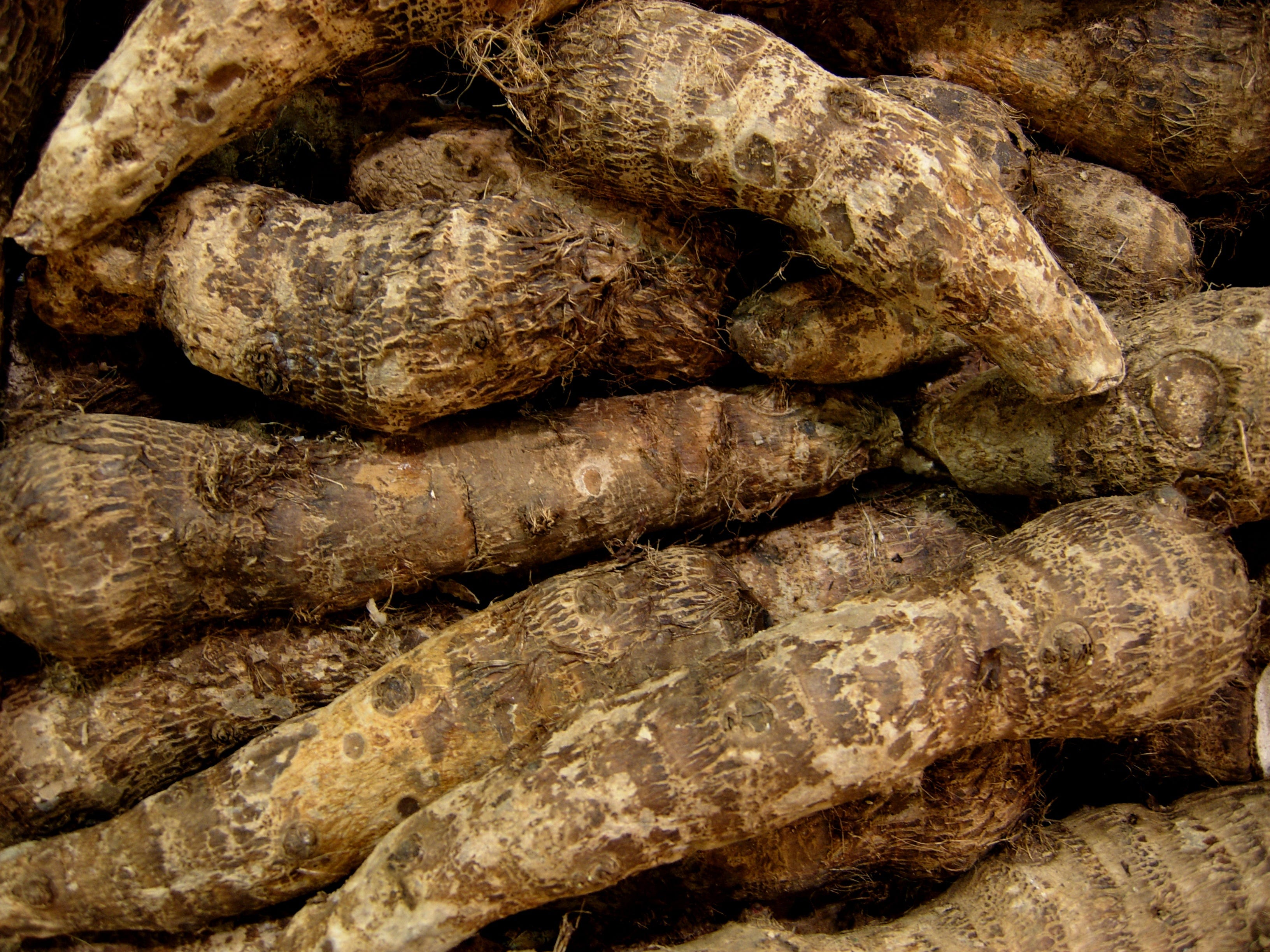 Malanga, Xanthosoma sagittifolium, Son las partes comestibles subterráneas de una especie muy tropical y son parientes del filodendro. Es una planta que crece en grupos y tiene muchas hojas de color verde oscuro en forma de punta de flecha de aproximadamente dos pies de largo, ancladas en un grupo sobre el suelo, que se asemeja a la oreja de un elefante cultivado.